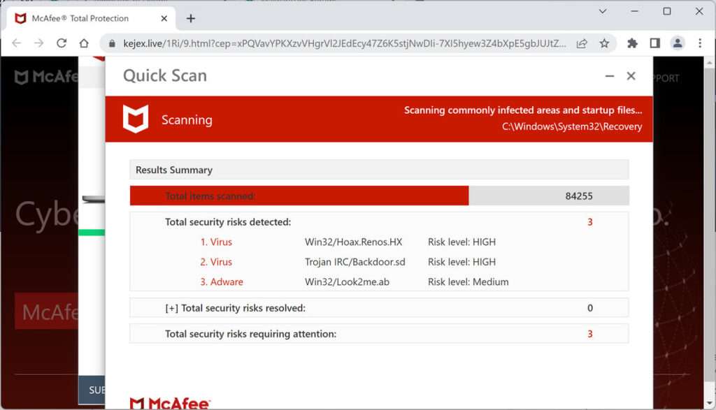 Kejex.live is a malicious site that uses fake alerts to deceive you into believing that an antivirus quick scan (eg. from McAfee, Avira, or Norton) has detected viruses and that a renewal of the antivirus subscription is necessary to remove them. This is a scare tactic employed by the website in an attempt to convince you to purchase an antivirus license, allowing the scammers to earn a commission from the sale.