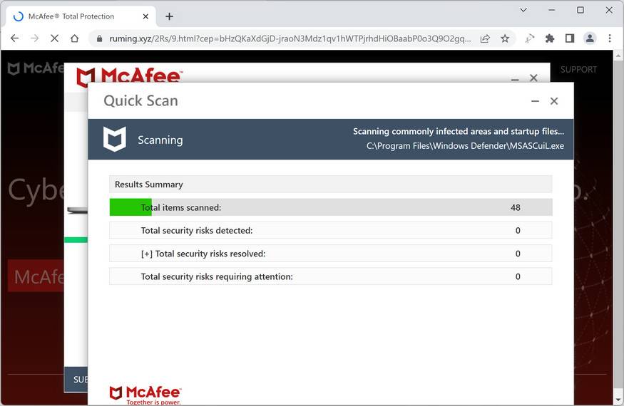 Ruming.xyz is a malicious site that uses fake alerts to deceive you into believing that an antivirus quick scan (eg. from McAfee, Avira, or Norton) has detected viruses and that a renewal of the antivirus subscription is necessary to remove them. This is a scare tactic employed by Ruming.xyz in an attempt to convince you to purchase an antivirus license, allowing the scammers to earn a commission from the sale.