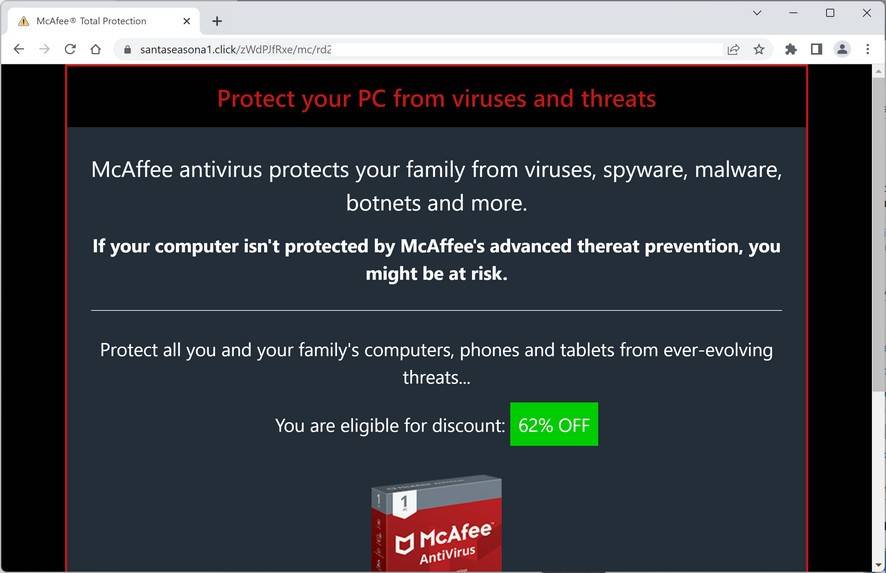 Santaseasona1.click displays a browser-based scam that tries to trick you into thinking that an antivirus (McAfee, Avira, or Norton) quick scan has detected 5 viruses and that you need to renew your antivirus subscription to remove them. It does this to scare you into buying an antivirus license so that the scammers can earn a commission from the sale.