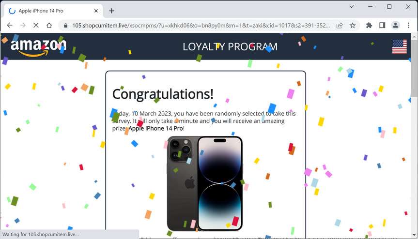 Shopcumitem.live is a site that claims to be from a legitimate company (eg; Amazon, Google, your Internet Service Provider) and then asks you to complete a survey to win a gift card or a tech prize (Samsung Galaxy, MacBook Pro, iPhone). If you complete this survey, in the end, you’ll be either asked to enter personal information such as credit card details, email, home address, or subscribe to unneeded paid services.