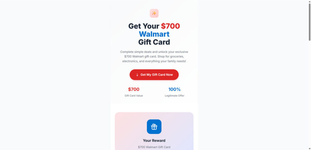 Personalized Touches Some versions of this scam include fake notifications in the bottom corner, claiming that “John from Texas just received a $750 Walmart gift card.” These notifications are fabricated and automatically generated by the site.