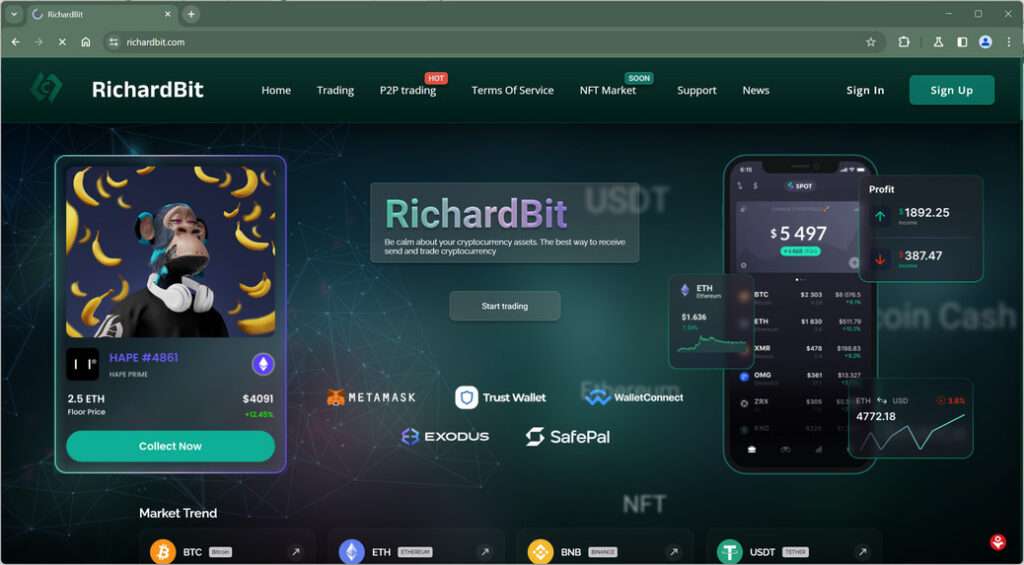 Despite slick graphics, RichardBit shows multiple red flags indicating its fraudulent nature. There are no real company details, owners, or ability to withdraw funds.