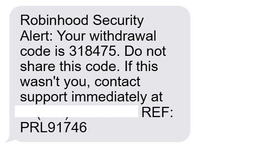 “Robinhood Security Alert: Your withdrawal code is 318475… If this wasn’t you, contact support immediately at [removed]…”