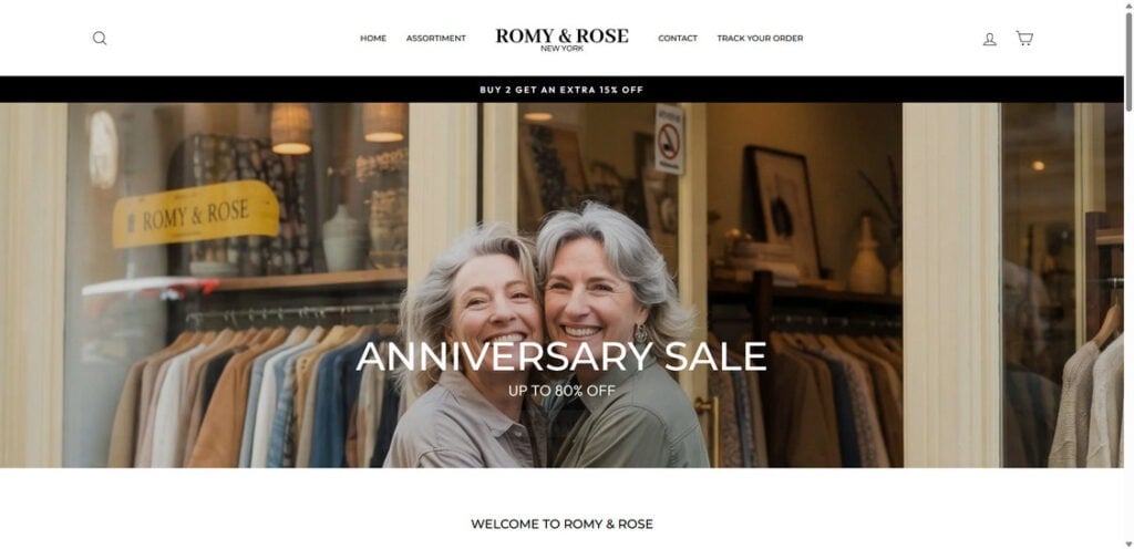 Romy & Rose New York fits a common high-risk “sale event” pattern: extreme discounts, urgency banners, a polished template, and claims meant to build trust fast. That does not prove fraud in every case, but it is enough to treat the store as high risk until you can verify it outside the site itself.
