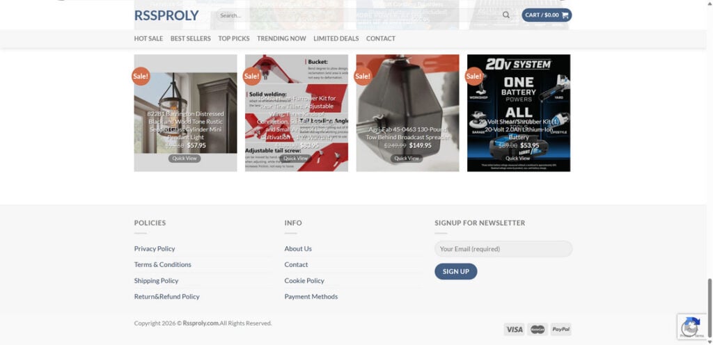 On the surface, Rssproly.com presents itself as a legitimate online retailer offering heavily discounted products at prices that undercut major brands. In practice, the site shows multiple indicators consistent with a scam operation designed to push shoppers into placing orders and submitting payment details and personal information.