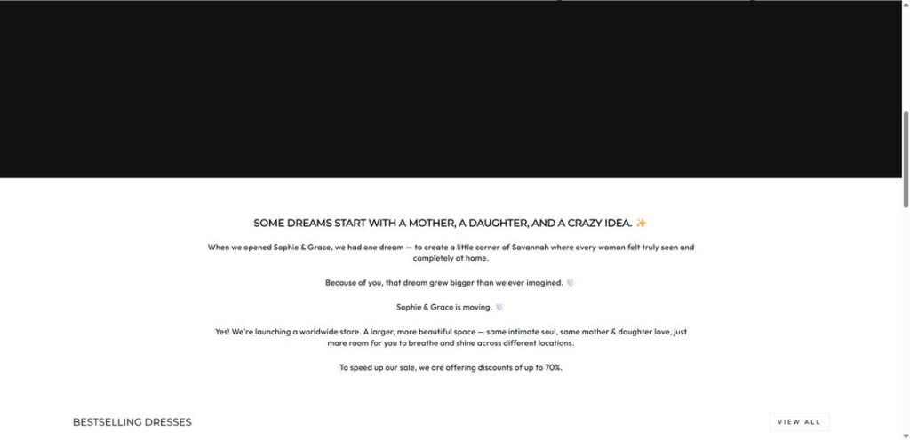 Sophia & Grace Savannah matches a common high-risk “sale event” storefront pattern that spreads through social media ads using urgency: closing sales, anniversary sales, event sales, and dramatic discounts like 70% to 90% off.