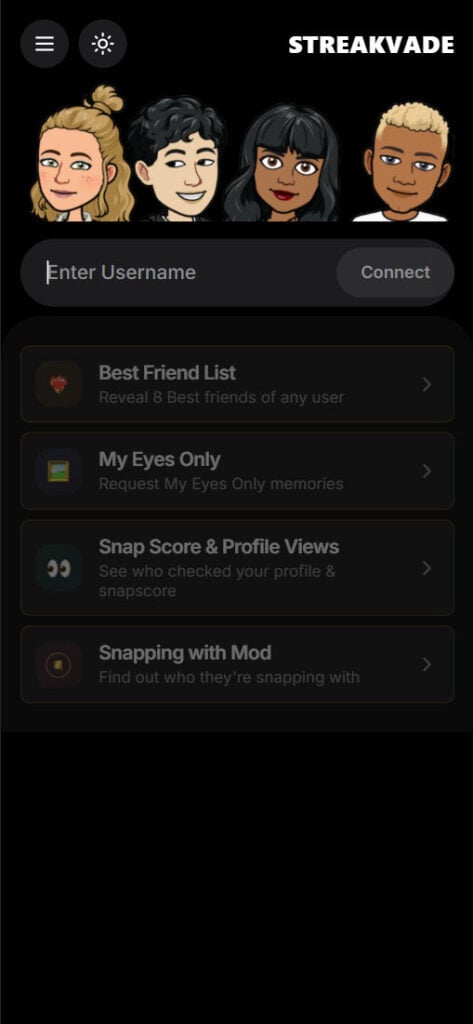 Streakvade presents itself like a Snapchat companion tool. The interface is intentionally simple: Enter Username and a Connect button, followed by feature tiles that look like official app functions.