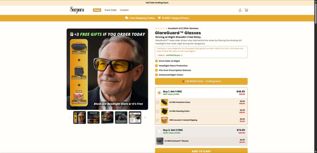 The Surpora Night Driving Glasses and their branded name GlareGuard™ are marketed as a breakthrough solution for safer night driving. In reality, they appear to be cheap imported glasses resold at a massive markup under misleading claims. The website’s reviews, statistics, and guarantees lack transparency, and the business structure follows the same blueprint used by countless dropshipping scams.