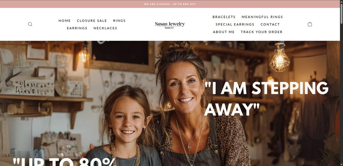 Susanjewelryco.com shows multiple red flags consistent with a scam or highly deceptive storefront, including unrealistic discounts, limited support channels (often only an email/contact form), and patterns that match known fake retail operations. The safest assumption is that it is not a trustworthy retailer.