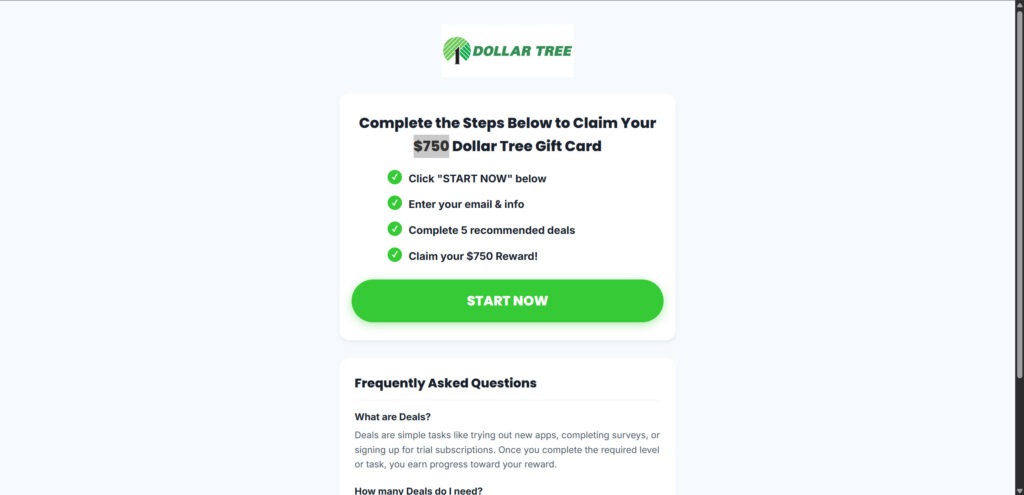 You land on a page promising a $750 Dollar Tree gift card. The branding looks convincing. The message is urgent: “Act now! Limited supply!”