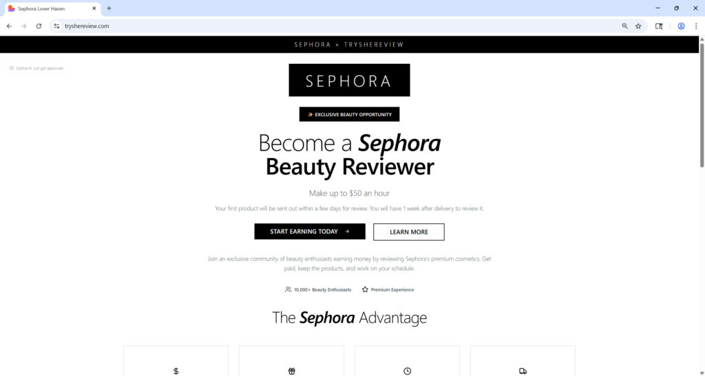 It looks sleek. It sounds promising. And it drops a name everyone trusts: Sephora. The TrySheReview.com website invites beauty lovers to earn up to $50 an hour as a Sephora Beauty Reviewer, promising free products and flexible work-from-home pay. But beneath the polished design and persuasive language lies a manipulative scam that’s leaving victims frustrated, exposed, and sometimes out of money.