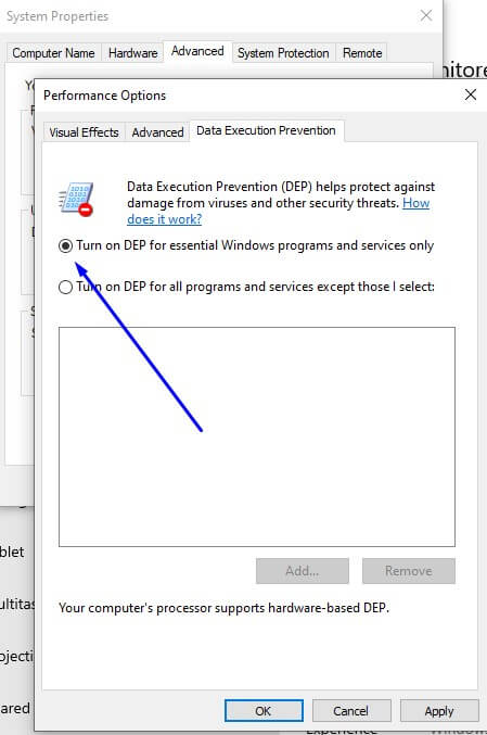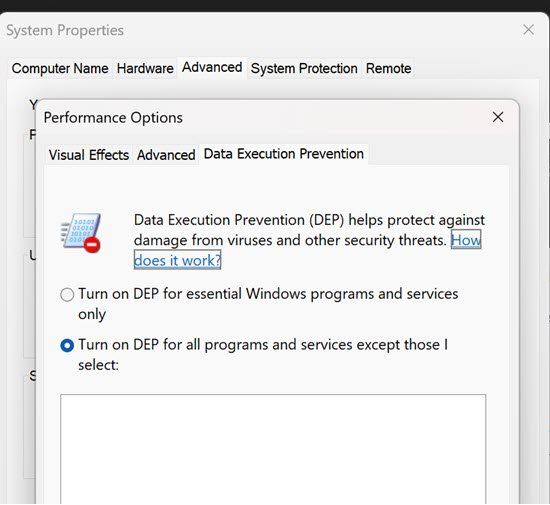 @Jonny Quest I searched for the settings that Avast modifies during the "Operating System Scanning" phase and found them. The one I mentioned called "Data Execution Prevention" and appear in the following image: