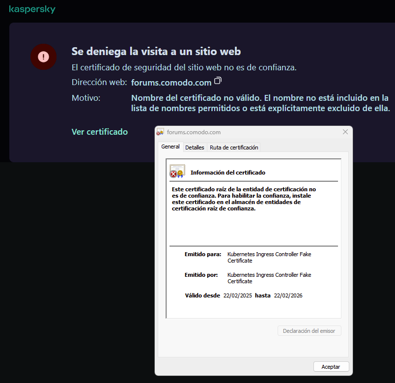The certificate is not fake. Nobody modified or tampered with the Comodo forum website certificate. It is a known issue with Kubernetes that has been reported many times.Kaspersky's products are good at identifying fake certificates. Many people don't like the fact that AV products manipulate certificates, and I completely agree, but Kaspersky can tell with millimeter precision whether a certificate is fake or tampered with, and I think that's incredible.