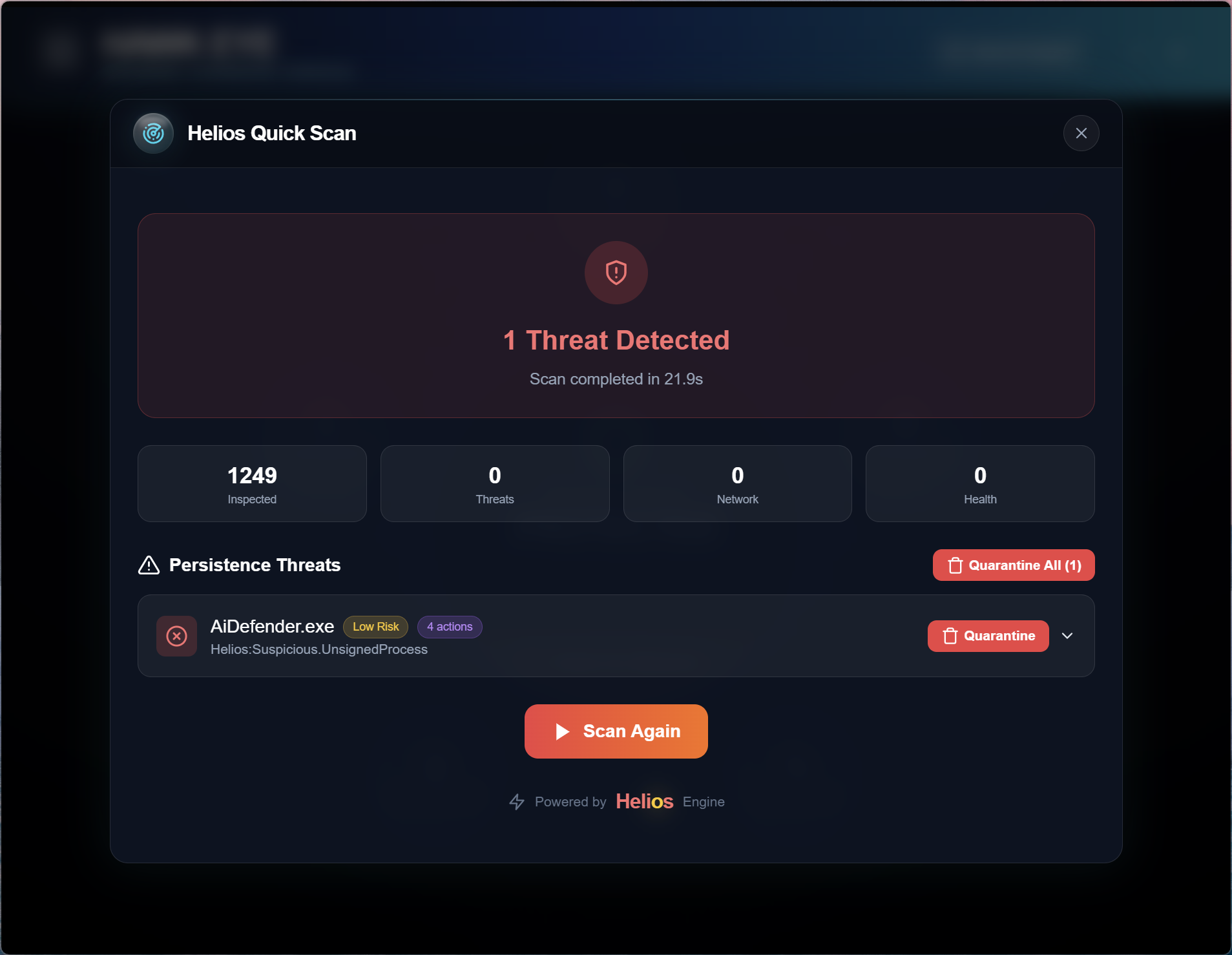 Yeah. That’s a design choice. I am creating a robust exclusions addition system. The scope of the scan was increased to now include processes and modules.The first time the Helios engine detects AiDefender: