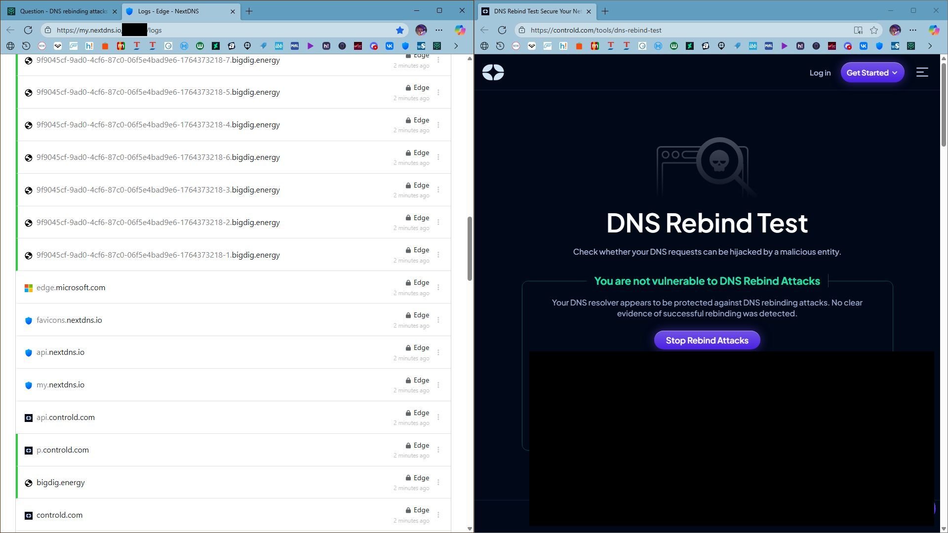 ControlD free failed to pass ControlD test; NextDNS and Aguard (with rebinding attack protection enabled in controld or rebinding attack hagezi list included in adguard) pass the test with success.I think that the problem is that the service uses ControlD and bigdig.energy to test, so it might be a little biased.