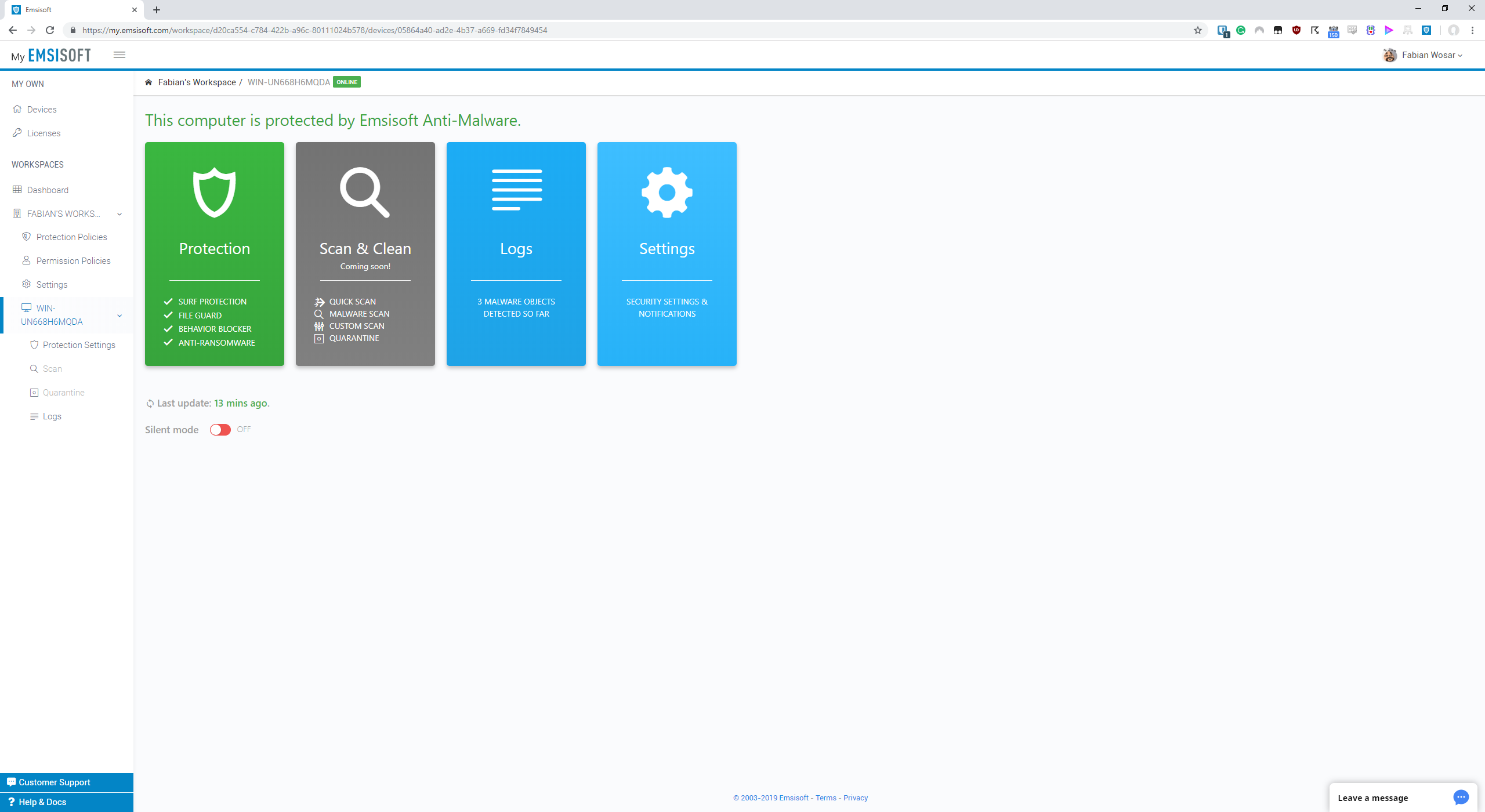 But let's get to the good stuff. Over the past couple of months, we introduced a new customer portal called MyEmsisoft. In the past, all you could do there was essentially manage your licenses. But that is going to change once we introduce the new workplace feature: