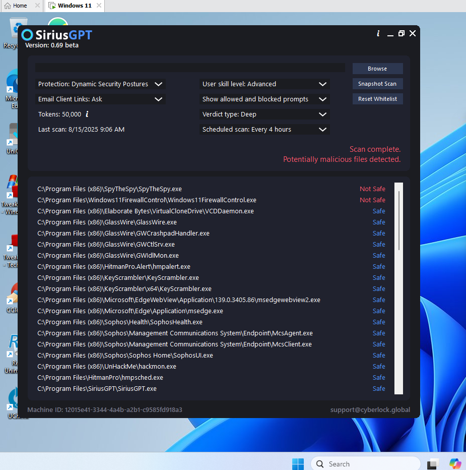 I ran a scan using SiriusGPT on my virtual machine, and it flagged two applications as unsafe. The reason given was the absence of a digital signature or publisher information which is similar to how Cyberlock WhiteCloud works.