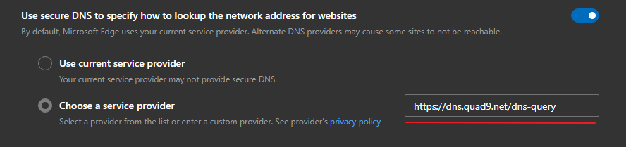 ok, I have DoH, and Quad9 selected in Edge settings, now, when I test my DNS with Web-based DNS Randomness Test | DNS-OARC it shows the Quad9 servers, and my ISP servers..... I have run this test with my other browsers, which are setup with similar configs, and they return results from their chosen DNS, with no sign of any ISP. I can only assume that the problem is with Edge... is there something that needs tweaking to solve this?