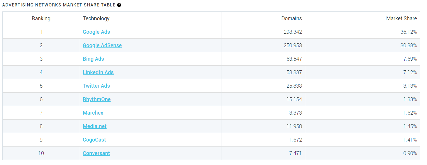 See for instance this website Datanyze on market share of Alexa Top 1 Million. Facebook is missing because it has its own platform, (same applies for Apple and Amazon), but Google, Facebook, Microsoft, Apple, Amazon are the big earners in this game. The internet is starting to divide in a Western web and Eastern web (headed by the big Chinese players), but they all want the same: COLLECT OUR DATA