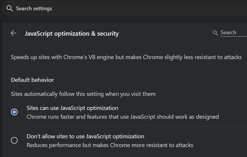 I also prefer fast browsing.This could help with prevent some forms of attack/vulnerabilities. JavaScript is not a low-level language like C/C++/Rust/Zig, it's a high-level language, so speed is comparatively slower than those (still very fast). JIT (Just-in-Time Compiler) is a feature that makes JavaScript run extremely fast. Still not as fast as low-level languages but close. If you use Chrome's "Don't allow sites to use JavaScript optimizations" or enable "Enhance your security on the web" feature in Edge, it disables some JIT related features. So, security increases at the cost of performance mainly on JavaScript heavy sites. It also disables Web-Assembly but Web-Assembly is not used by most sites.