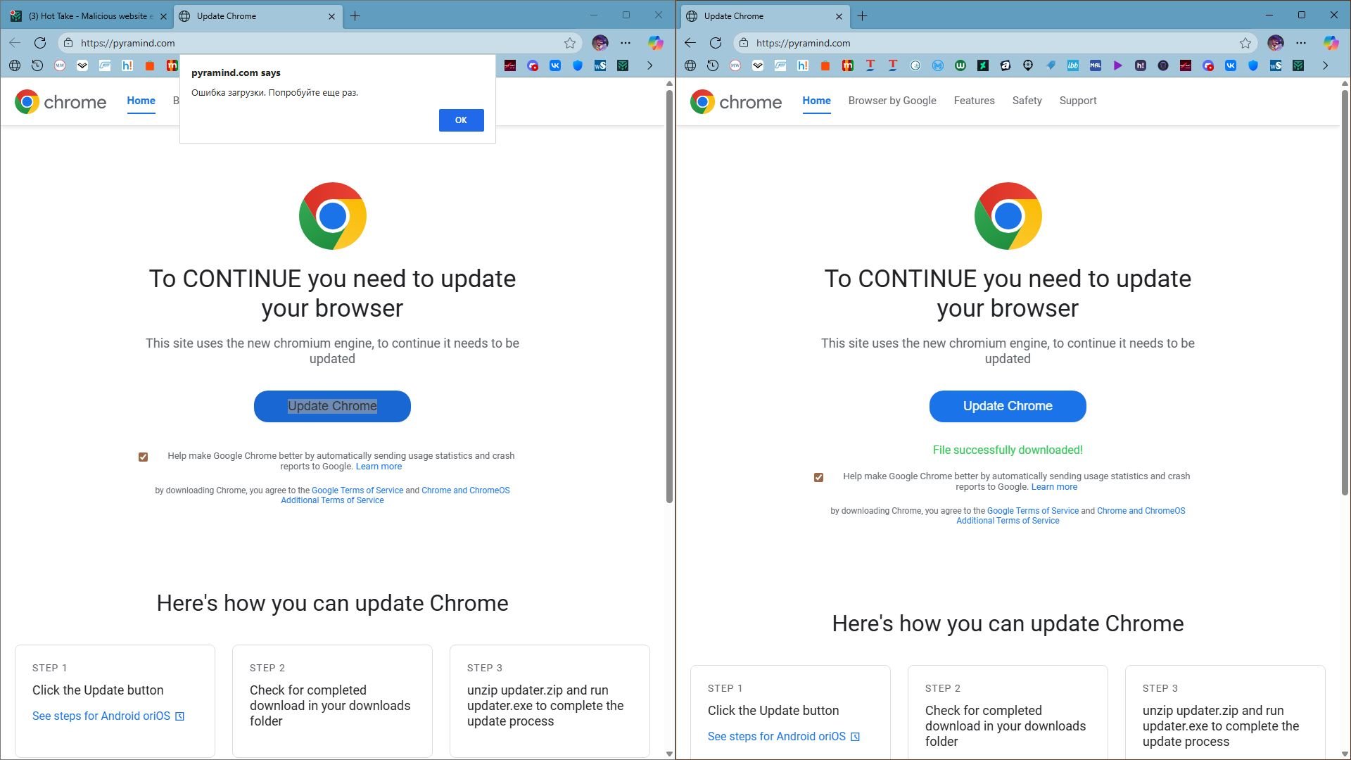 The link is detected by Norton and its family, but the malicious fake Chrome Updater is not detected.This list was all clean yesterday; also Norton safeweb was labeling it as safe yesterday.