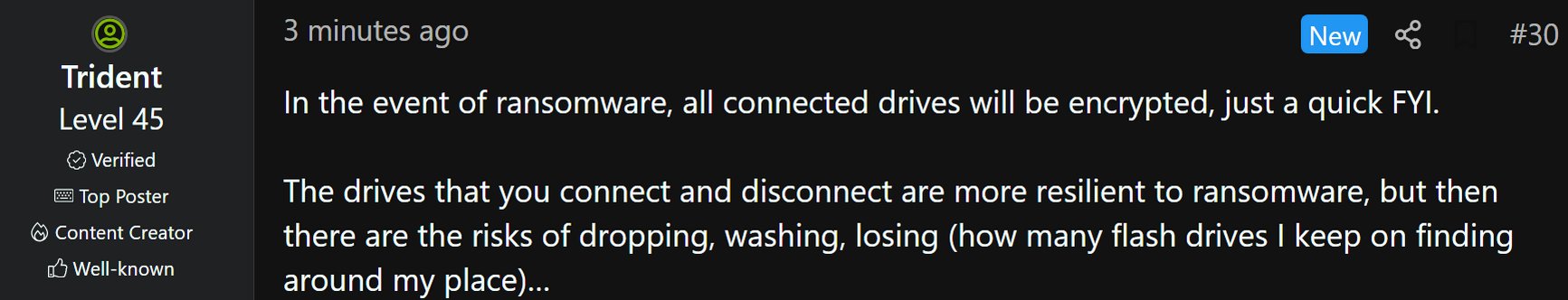 The drives that you connect and disconnect are more resilient to ransomware, but then there are the risks of dropping, washing, losing (how many flash drives I keep on finding around my place)…