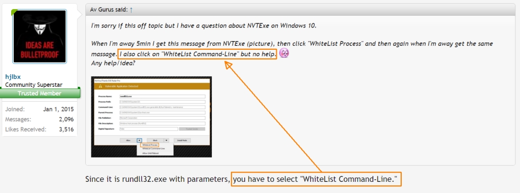 When I'm away 5min I get this message from NVTExe (picture), then click "WhiteList Process" and then again when I'm away get the same massage. I also click on "WhiteList Command-Line" but no help.