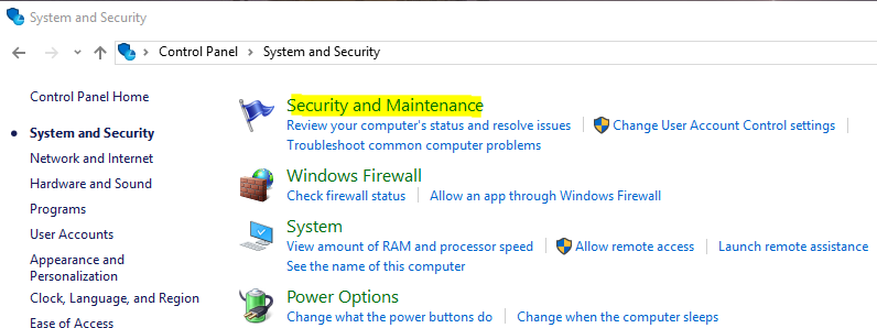 Then click on security and maintenance