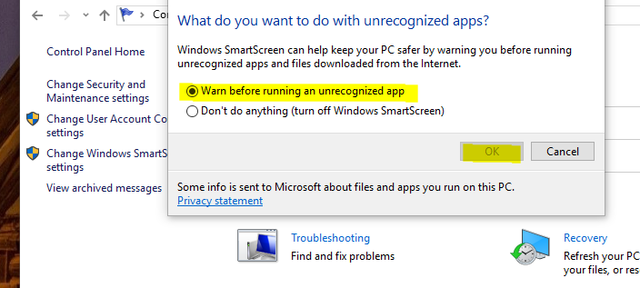 Then tick the radio button next to warn before running an unrecognized app