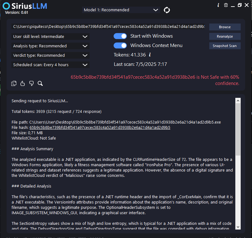 First, I ran Sirius LLM, the portable version made available by @danb himself here in the thread that I downloaded. I hadn't downloaded the malware sample yet. So, I just ran a scan with Sirius LLM on my computer, and it analyzed all the active processes running, and all of them were considered safe. I believe that here it may have used WhitelistCloud. I assume @danb can correct me if I'm wrong. So, as I'm curious, it's a new tool for me, so I had this idea of looking for some new malware samples on the web, which is quite easy to find today. When you download these samples, they come compressed and password-protected, precisely so they are not deleted by AVs when downloaded. These samples are useful for security experts to analyze, demystify, and reverse engineer, especially when it is malware created and sponsored by the state. Of course, they are also useful for enthusiasts, malware testers, and curious people like me lol. Before extracting the sample from the compressed file, I had to disable my real-time AV protection to extract the sample to my desktop, which I did on my physical machine. I extracted the sample to my desktop and ran a new scan with Sirius LLM, which had already analyzed my computer's execution processes and deemed it safe. With the sample already on my desktop, I ran another scan with Sirius LLM, and it almost instantly flagged this file as unsafe in red. I came to the conclusion that Sirius LLM works similarly to an AV that scans new and tampered files. Since this malware sample was new, I had extracted it to my desktop after running the first scan with Sirius, so on the second scan, Sirius LLM detected this sample without any major problems.You downloaded malware file and left it on your desktop,