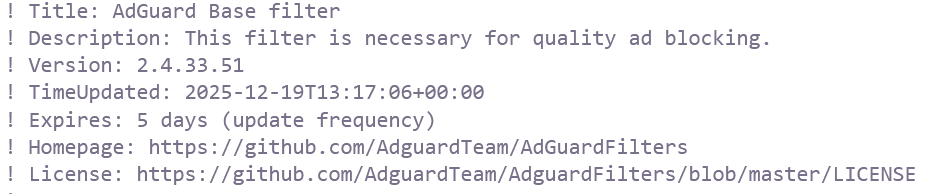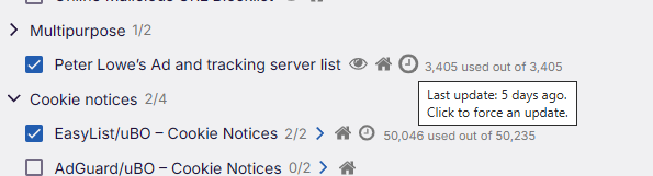 Easylist expires even in more time (9 days), however, uBO checks it for update every few hoursuBlock Origin does update AdGuard filters normally, but it does so every 5 days because AdGuard team ships their filter with "expires" tag which explicitly says the list expires every 5 days.