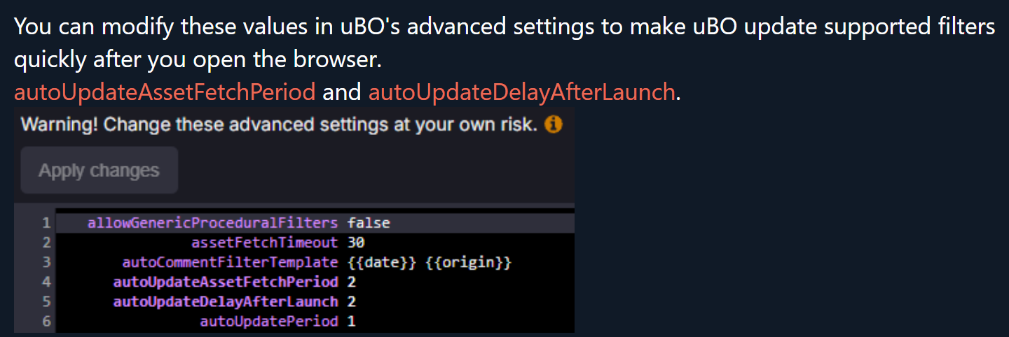 The changes I suggested was to make uBO update supported differential filter quickly after opening the browser. So, when you open your browser, you are likely to have latest filters updates within 3-10 seconds. But since EasyList cookie doesn't support differential filter, the default update frequency is still honored.Well that didn't work. I am guessing these are not supported filter.