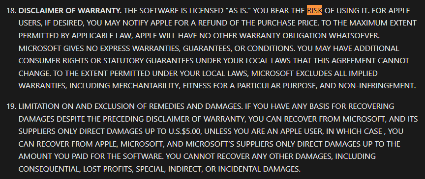 This is the link to the license terms and conditions covering ALL Microsoft Defender versions from the one everyone knows on their local systems all the way up through the Government versions (Microsoft accepts no risk and no fitness or failures of the product; the Subscriber/User assumes full accountability and responsibility for its use and any negative consequences within the realm of security failures). If anyone does not understand EULAs and License/Subscription Agreement legalese then most of the clauses will not be understood, but the key items are 18 and 19." No matter what anyone from Microsoft posts online, the only legally binding terms are contracts, licenses, and EULAs: