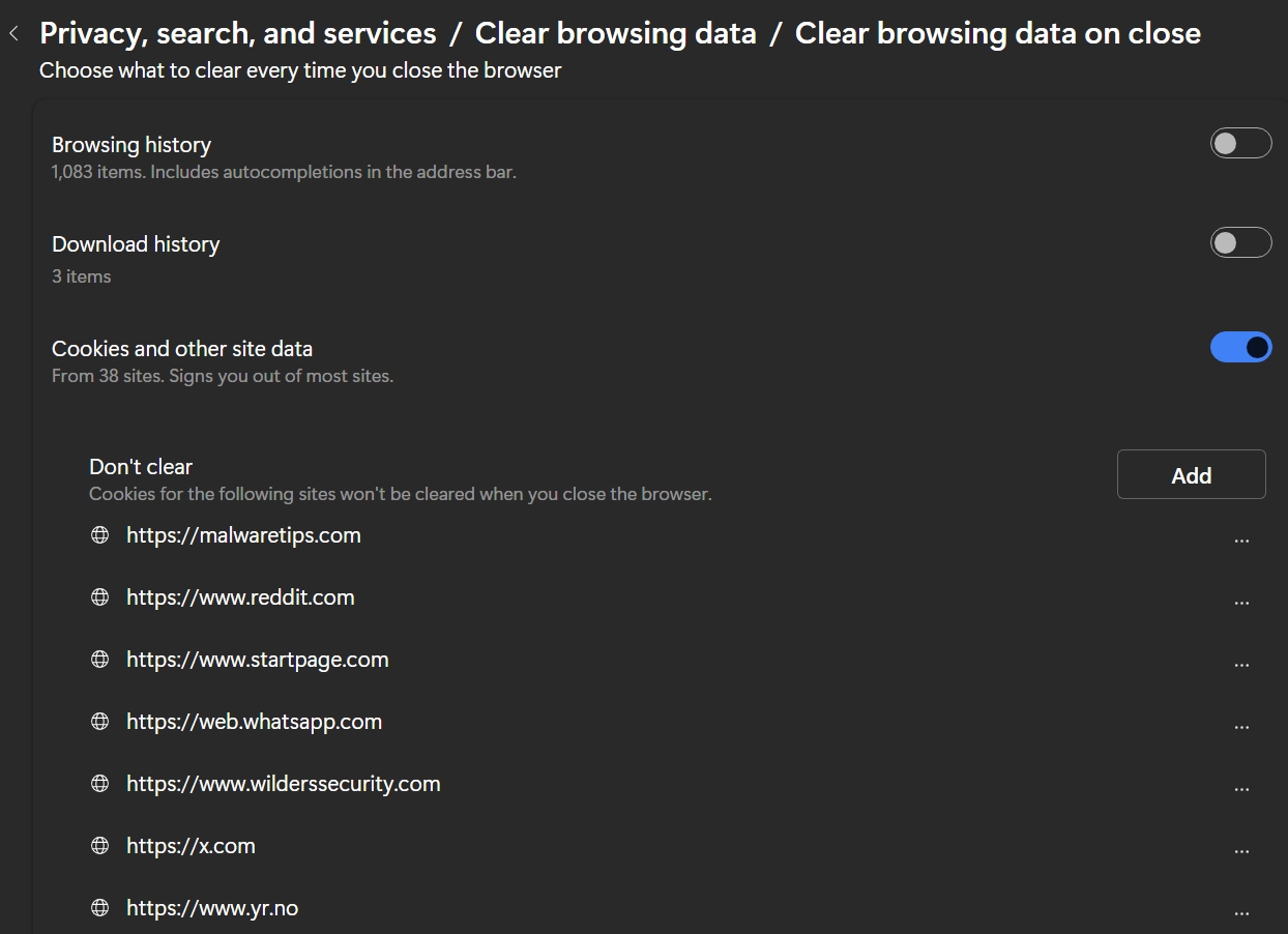 Must be a bug; when I add exclusion for Google search or Startpage, the saved settings are kept unchanged.This will not work because it is reset in the same session, so keeping it will not help.