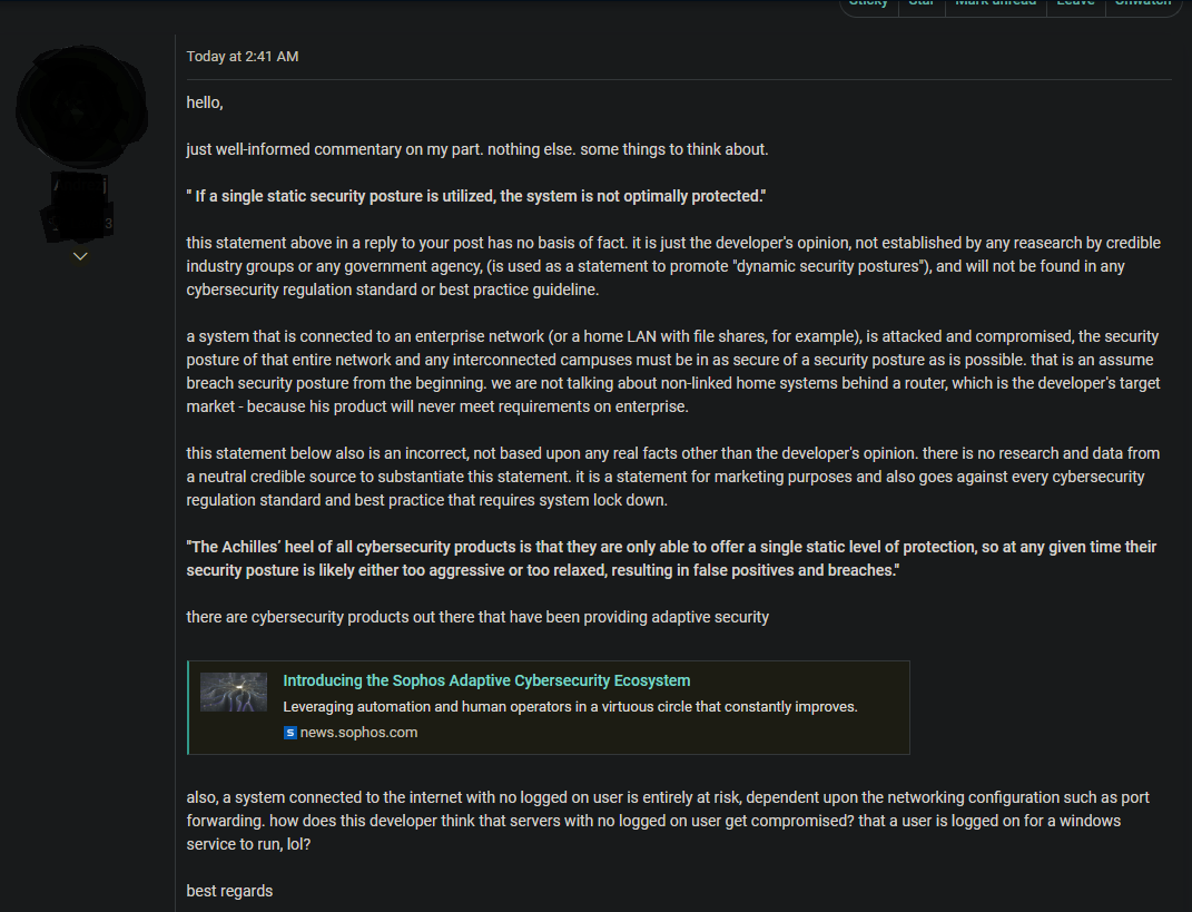 Sophos is a great product, so I am certainly not bashing them when I point out that the article JT posted, entitled "Introducing the Sophos Adaptive Cybersecurity Ecosystem" was published on MAY 05, 2021, almost 11 years to the day that VS was created.